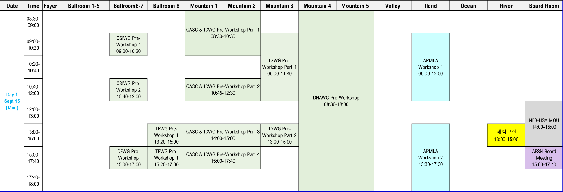 | Pre-Workshop | WG Breakout | WG Breakout |